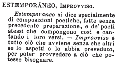 | Estemporaneo, Improvviso - Estemporaneo si dice specialmente di composizioni poetiche, fatte senza precedente preparazione, e de' poeti stessi che compongono così e cantando i loro versi. - Improvviso è tutto ciò che avviene senza che altri se lo aspetti o lo abbia preveduto, per poter provvedere a ciò che potesse bisognare. [immagine] |