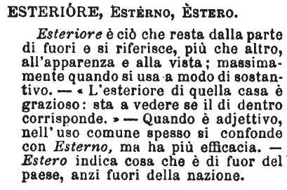 | Esteriore, Esterno, Estero - Esteriore è ciò che resta dalla parte di fuori e si riferisce, più che altro, all'apparenza e alla vista; massimamente quando si usa a modo di sostantivo. - «L'esteriore di quella casa è grazioso: sta a vedere se il di dentro corrisponde.» - Quando è adjettivo, nell'uso comune spesso si confonde con Esterno, ma ha più efficacia. - Estero indica cosa che è di fuor del paese, anzi fuori della nazione. [immagine] |