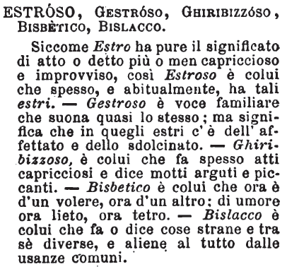 | Estroso, Gestroso, Ghiribizzoso, Bisbetico, Bislacco - Siccome Estro ha pure il significato di atto o detto più o men capriccioso e improvviso, così Estroso è colui che spesso, e abitualmente, ha tali estri. - Gestroso è voce familiare che suona quasi lo stesso; ma significa che in quegli estri c'è dell'affettato e dello sdolcinato. - Ghiribizzoso, è colui che fa spesso atti capricciosi e dice motti arguti e piccanti. - Bisbetico è colui che ora è di un volere, ora d'un altro; di umore ora lieto, ora tetro. - Bislacco è colui che fa o dice cose strane e tra sè diverse, e aliene al tutto dalle usanze comuni. [immagine] |