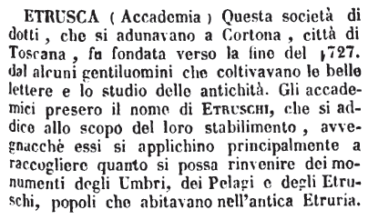 | Etrusca (Accademia) - Questa società di dotti, che si adunavano a Cortona, città di Toscana, fu fondata verso la fine del 1727. dal alcuni gentiluomini che coltivavano le belle lettere e lo studio delle antichità. Gli accademici presero il nome di Etruschi, che si addice allo scopo del loro stabilimento, avvegnacchè essi si applichino principalmente a raccogliere quanto si possa rinvenire dei monumenti degli Umbri, dei Pelagi e degli Etruschi, popoli che abitavano nell'antica Etruria. [immagine] |
