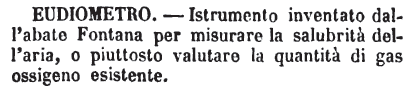 | Eudiometro - S. m. (Fis.) [Sel.] Strumento col mezzo del quale si determina la quantità di ossigeno contenuto nell'aria, col mezzo di una certa quantità d'idrogeno mescolato con un dato volume d'aria, entro cui si fa scattare la scintilla elettrica. |