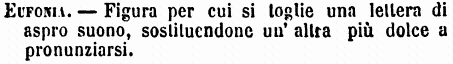 | Eufonia - Figura per cui si toglie una lettera di aspro suono, sostituendone un'altra più dolce a pronunziarsi. [immagine] |