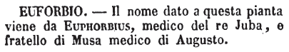 | Euforbio - Il nome dato da questa pianta viene da Euphorbius, medico del re Juba, e fratello di Musa medico di Augusto. [immagine] |