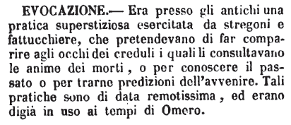 | Evocazione - Era presso gli antichi una pratica superstiziosa esercitata da stregoni e fattucchiere, che pretendevano di far comparire agli occhi dei cruduli i quali li consultavano le anime dei morti, o per conoscere il passato o per trarne predizioni dell'avvenire. Tali pratiche sono di data remotissima, ed erano digià in uso ai tempi di Omero. [immagine] |