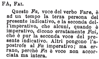 | Fa, Fai - Questo Fa, voce del verbo Fare, è ad un tempo la terza persona del presente indicativo, e la seconda dell'imperativo, che alcuni, quando è imperativo, dicono erratamente Fai, che è pur la seconda voce del presente indicativo. Altri pongono l'apostrofe al Fa imperativo; ma errano, perché Fa è voce non accorciata ma intera. [immagine] |