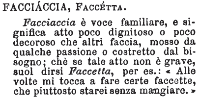 | Facciaccia, Faccetta - Facciaccia è voce familiare, e significa atto poco dignitoso o poco decoroso che altri faccia, mosso da qualche passione o costretto dal bisogno; chè se tale atto non è grave, suol dirsi Faccetta, per es.: «Alle volte mi tocca a fare certe faccette, che piuttosto starei senza mangiare.» [immagine] |