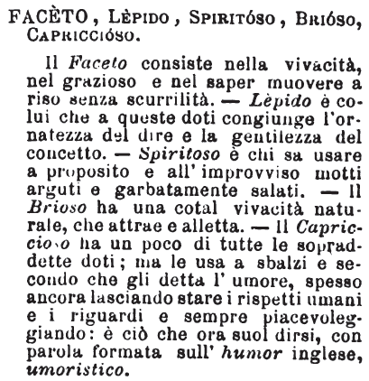 | Faceto, Lepido, Spiritoso, Brioso, Capriccioso - Il Faceto consiste nella vivacità, nel grazioso e nel saper muovere a riso senza scurrilità. - Lèpido è colui che a queste doti congiunge l'ornatezza del dire e la gentilezza del concetto. - Spiritoso è chi sa usare a proposito e all'improvviso motti arguti e garbatamente salati. - Il Brioso ha una cotal vivacità naturale, che attrae e alletta. - Il Capriccioso ha un poco di tutte le sopraddette doti; ma le usa a sbalzi e secondo che gli detta l'umore, spesso ancora lasciando stare i rispetti umani e i riguardi e sempre piacevoleggiando: è ciò che ora suol dirsi, con parola formata sull'humor inglese, umoristico. [immagine] |