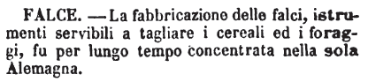 | Falce - La fabbricazione delle falci, istrumenti servibili a tagliare i cereali ed i foraggi, fu per lungo tempo concentrata nella sola Alemagna. [immagine] |
