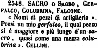 | Sacro o Sagro, Gerfalco, Colubrina, Falcone - «Nomi di pezzi di artiglieria». Presi un mio gerfalco, il qual pezzo si è maggiore e più lungo d'un sacro, quasi come una mezza colubrina». Cellini. [immagine] |