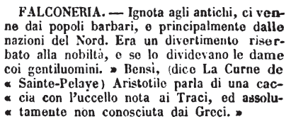 | Falconeria - Ignota agli antichi, ci venne dai popoli barbari, e principalmente dalle nazioni del Nord. Era un divertimento riserbato alla nobiltà, e se lo dividevano le dame coi gentiluomini. « Bensì (dice La Curne de Sainte- Pelaye) Aristotile parla di una caccia con l'uccello nota ai Traci ed assolutamente non conosciuta dai Greci. » [immagine] |