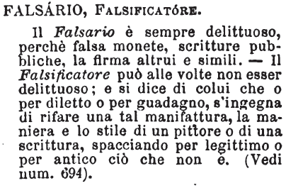 | Falsario, Falsificatore - Il Falsario è sempre delittuoso, perchè falsa monete, scritture pubbliche, la firma altrui e simili. - Il Falsificatore può alle volte non esser delittuoso; e si dice di colui che o per diletto o per guadagno, s'ingegna di rifare una tal manifattura, la maniera e lo stile di un pittore o di una scrittura, spacciando per legittimo o per antico ciò che non è. (Vedi num. 694). [immagine] |