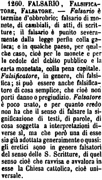 | Falsario, Falsificatore, Falsatore - Falsario è termine d'obbrobrio; falsario di monete, di cambiali, di atti, di scritture; il falsario è punito severamente dalla legge perfin colla galera; e in qualche paese, per qualche caso, cioè per le monete e per le cedole del debito pubblico e la carta monetata, colla pena capitale. Falsificatore, in genere, chi falsifica; si può essere anche falsificatore di cosa semplice, che cioè non porti danno o pregiudizio. Falsatore è poco usato, e per quanto credo non ha che il senso di falsare la significazione di testi, di parole, di cosa soggetta a interpretazioni diverse sì, ma che però una di esse sia già adottata generalmente o quasi: gli eretici sono in genere falsatori del senso delle S. Scritture, di quel senso cioè che ravvisa e avvalora in esse la Chiesa cattolica, cioè universale. [immagine] |