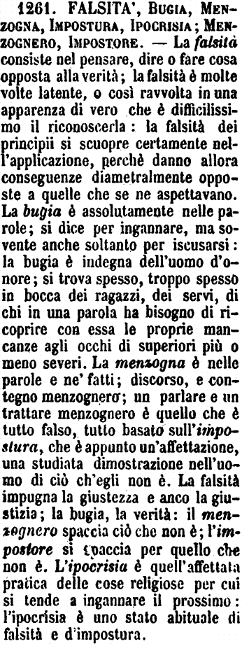 | Falsità, Bugia, Menzogna, Impostura, Ipocrisia; Menzognero, Impostore - La falsità consiste nel pensare, dire o fare cosa opposta alla verità; la falsità è molte volte latente, o così ravvolta in una apparenza di vero che è difficilissimo il riconoscerla: la falsità dei principii si scuopre certamente nell'applicazione, perchè danno allora conseguenze diametralmente opposte a quelle che se ne aspettavano. La bugia è assolutamente nelle parole; si dice per ingannare, ma sovente anche soltanto per iscusarsi: la bugia è indegna dell'uomo d'onore; si trova spesso, troppo spesso in bocca dei ragazzi, dei servi, di chi in una parola ha bisogno di ricoprire con essa le proprie mancanze agli occhi di superiori più o meno severi. La menzogna è nelle parole e ne' fatti; discorso, e contegno menzognero; un parlare e un trattare menzognero è quello che è tutto falso, tutto basato sull'impostura, che è appunto un'affettazione, una studiata dimostrazione nell'uomo di ciò ch'egli non è. La falsità impugna la giustezza e anco la giustizia; la bugia, la verità: il menzognero spaccia ciò che non è; l'impostore si spaccia per quello che non è. L'ipocrisia è quell'affettata pratica delle cose religiose per cui si tende a ingannare il prossimo: l'ipocrisia è uno stato abituale di falsità e d'impostura. [immagine] |