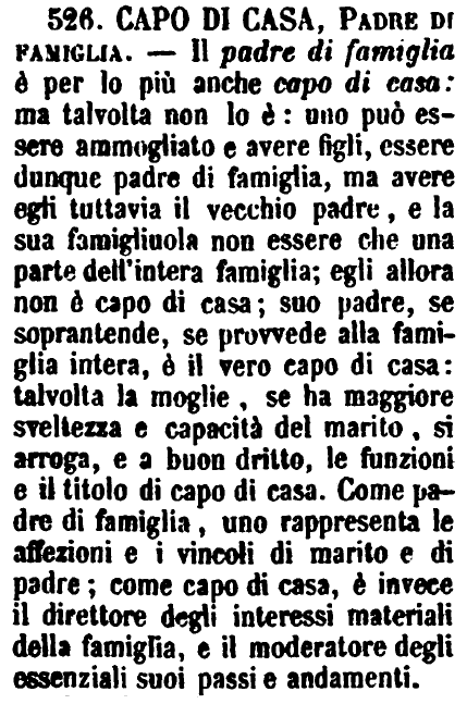 Capo di casa, Padre di famiglia - Il padre di famiglia è per lo più anche capo di casa: ma talvolta non lo è: uno può essere ammogliato e avere figli, essere dunque padre di famiglia, ma avere egli tuttavia il vecchio padre, e la sua famigliuola non essere che una parte dell'intera famiglia; egli allora non è capo di casa; suo padre, se soprantende, se provvede alla famiglia intera, è il vero capo di casa: talvolta la moglie, se ha maggiore sveltezza e capacità del marito, si arroga, e a buon diritto, le funzioni e il titolo di capo di casa. Come padre di famiglia, uno rappresenta le affezioni e i vincoli di marito e di padre; come capo di casa, è invece il direttore degli interessi materiali della famiglia, e il moderatore degli essenziali suoi passi e andamenti. [immagine]