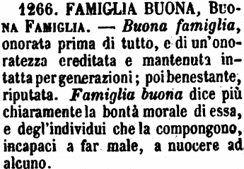 Famiglia buona, Buona famiglia - Buona famiglia, onorata prima di tutto, e di un'onoratezza ereditata e mantenuta intatta per generazioni; poi benestante, riputata. Famiglia buona dice più chiaramente la bontà morale di essa, e degl'individui che la compongono, incapaci a far male, a nuocere ad alcuno. [immagine]