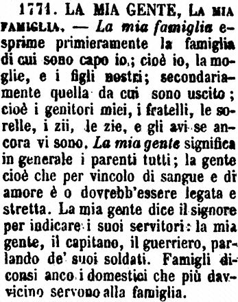 La mia gente, La mia famiglia - La mia famiglia esprime primieramente la famiglia di cui sono capo io; cioè io, la moglie, e i figli nostri; secondariamente quella da cui sono uscito; cioè i genitori miei, i fratelli, le sorelle, i zii, le zie, e gli avi se ancora vi sono. La mia gente significa in generale i parenti tutti; la gente cioè che per vincolo di sangue e di amore è o dovrebb'essere legata e stretta. La mia gente dice il signore per indicare i suoi servitori: la mia gente, il capitano, il guerriero, parlando de' suoi soldati. Famigli diconsi anco i domestici che più davvicino servono alla famiglia. [immagine]