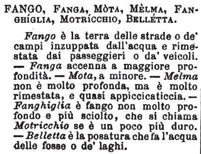 | Fango, Fanga, Mota, Melma, Fanghiglia, Motricchio, Belletta - Fango è la terra delle strade o de' campi inzuppata dall'acqua e rimestata dai passeggieri o da' veicoli. - Fanga accenna a maggiore profondità. - Mota, a minore. - Melma non è molto profonda, ma è molto rimestata, e quasi appiccicaticcia. - Fanghiglia è fango non molto profondo e più sciolto, che si chiama Motricchio se è un poco più duro. - Belletta è la posatura che fa l'acqua delle fosse o de' laghi. [immagine] |
