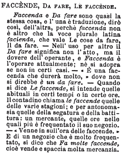 | Faccende, Da fare, Le faccende - Faccenda e Da fare sono quasi la stessa cosa, e l'una è traduzione, dirò così, dell'altra, perchè faccenda non è altro che la voce plurale latina facienda, che vale Le cose da fare, Il da fare. - Nell'uso per altro il Da fare significa non l'atto, ma il dovere dell'operante, e Faccenda è l'operare attualmente; nè si adopra se non in certi casi. - «E' una faccenda che durerà molto,» dove non si direbbe è un da fare. - Quando si dice Le faccende, si intende quelle abituali in certi tempi o in certe ore. Il contadino chiama le faccende quelle delle varie stagioni; e per antonomasia quelle della segatura e della battitura: un mercante, quelle ore nelle quali più è frequentato il suo negozio. - «Venne in sull'ora delle faccende.» E di un negozio che è molto frequentato, si dice che Fa molte faccende, cioè vende e spaccia molta mercanzia. [immagine] |