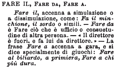 | Fare il, Fare da, Fare a - Fare il, accenna a simulazione o a dissimulazione, come: Fa il minchione, il sordo o simili. - Fare da è Fare ciò che è ufficio o consuetudine di altra persona. - «Il direttore è fuori, e fa lui da direttore.» - La frase Fare a accenna a gara, e si dice specialmente di giuochi: Fare al biliardo, a primiera, Fare a chi più dura. [immagine] |