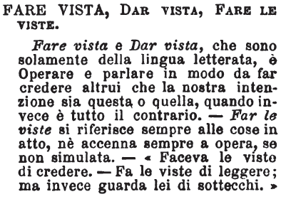 | Fare vista, Dar vista, Fare le viste - Fare vista e Dar vista, che sono solamente della lingua letterata, è Operare e parlare in modo da far credere altrui che la nostra intenzione sia questa o quella, quando invece è tutto il contrario. - Far le viste si riferisce sempre alle cose in atto, nè accenna sempre a opera, se non simulata. - "Faceva le viste di credere. - Fa le viste di leggere; ma invece guarda lei di sottecchi." [immagine] |
