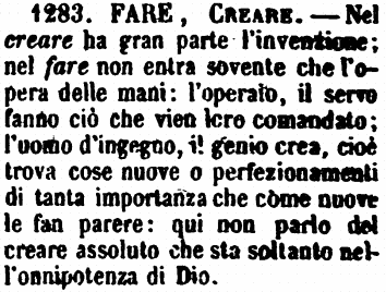| Fare, Creare - Nel creare ha gran parte l'invenzione; nel fare non entra sovente che l'opera delle mani: l'operaio, il servo fanno ciò che vien loro comandato; l'uomo d'ingegno, il genio crea, cioè trova cose nuove o perfezionamenti di tanta importanza che come nuove le fan parere: qui non parlo del creare assoluto che sta soltanto nell'onnipotenza di Dio. [immagine] |