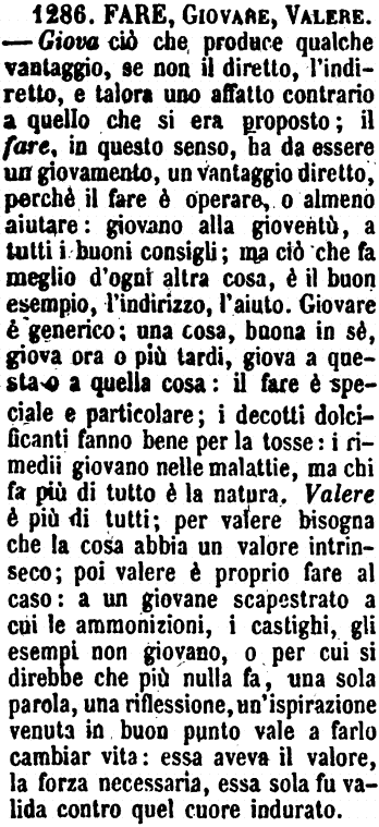| Fare, Giovare, Valere - Giova ciò che produce qualche vantaggio, se non il diretto, l'indiretto, e talora un affatto contrario a quello che si era proposto; il fare, in questo senso, ha da essere un giovamento, un vantaggio diretto, perchè il fare è operare, o almeno aiutare: giovano alla gioventù, a tutti i buoni consigli; ma ciò che fa meglio d'ogni altra cosa, è il buon esempio, l'indirizzo, l'aiuto. Giovare è generico; una cosa, buona in sè, giova ora o più tardi, giova a questa o a quella cosa: il fare è speciale e particolare; i decotti dolcificanti fanno bene per la tosse: i rimedii giovano nelle malattie, ma chi fa più di tutto è la natura. Valere è più di tutti; per valere bisogna che la cosa abbia un valore intrinseco; poi valere è proprio fare al caso: a un giovane scapestrato a cui le ammonizioni, i castighi, gli esempi non giovano, o per cui si direbbe che più nulla fa, una sola parola, una riflessione, un'ispirazione venuta in buon punto vale a farlo cambiar vita: essa aveva il valore, la forza necessaria, essa sola fu valida contro quel cuore indurato. [immagine] |