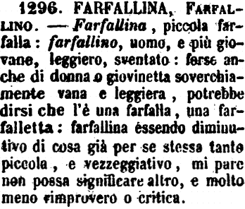 | Farfallina, Farfallino - Farfallina, piccola farfalla: farfallino, uomo, e più giovane, leggiero, sventato: forse anche di donna o giovinetta soverchiamente vana e leggiera, potrebbe dirsi che l'è una farfalla, una farfalletta: farfallina essendo diminutivo di cosa già per se stessa tanto piccola, e vezzeggiativo, mi pare non possa significare altro, e molto meno rimprovero o critica. [immagine] |