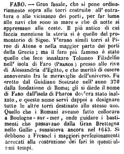 | Faro - Torre sulla marina, così detta dal nome dell'isola di Pharos avanti Alessandria d'Egitto, ove erasi fabbricata per ordine di Tolomeo Filadelfo. In cima a questa Torre, che annoverasi tra le sette Maraviglie del Mondo, eravi un Fanale per far lume durante la notte alle navi, che radevano le coste Egiziane, piene di scogli e di secche o banchi di sabbia. Da cui, hanno preso il nome di Faro tutte le altre Torri destinate a questo medesimo oggetto. |