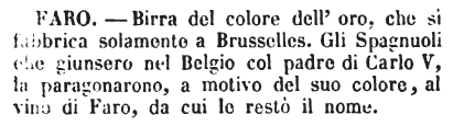 | Faro - Birra del colore dell'oro, che si fabbrica solamente a Brusselles. Gli Spagnuoli che giunsero nel Belgio col padre di Carlo V, la paragonarono, a motivo del suo colore, al vino di Faro, da cui restò il nome. [immagine] |