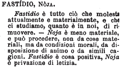 | Fastidio, Noja - Fastidio è tutto ciò che molesta attualmente e materialmente, e che ci studiamo, quanto è in noi, di rimuovere. - Noja è meno materiale, e può procedere, non da cose materiali, ma da condizioni morali, da disposizione di animo o da simili cagioni. Fastidio è cosa positiva, Noja è privazione di letizia. [immagine] |