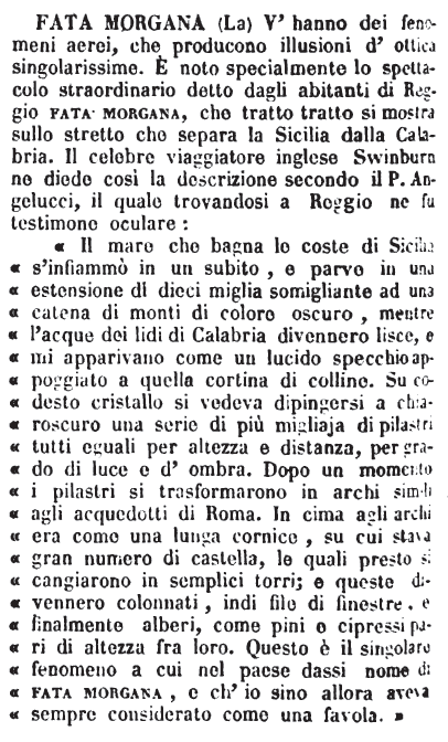 | Fata morgana (la) - V'hanno dei fenomeni aerei, che producono illusioni d'ottica singolarissime. È noto specialmente lo spettacolo straordinario detto dagli abitanti di Reggio fata morgana, che tratto tratto si mostra sullo stretto che separa la Sicilia dalla Calabria. Il celebre viaggiatore inglese Swinburn ne diede così la descrizione secondo il P. Angelucci, il quale trovandosi a Reggio ne fu testimone oculare: