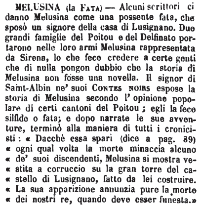 | Melusina (la Fata) - Alcuni scrittori ci danno Melusina come una possente fata, che sposò un signore della casa di Lusignano. Due grandi famiglie del Poitou e del Delfinato portarono nelle loro armi Melusina rappresentata da Sirena, lo che fece credere a certe genti che di nulla pongon dubbio che la storia di Melusina non fosse una novella. Il signor di Saint-Albin ne' suoi Contes noirs espose la storia di Melusina secondo l'opinione popolare di certi cantoni del Poitou; egli la fece silfide o fata; e dopo narrate le sue avventure, terminò alla maniera di tutti i cronicisti: «Dacchè essa sparì (dice a pag. 89) ogni qual volta la morte minaccia alcuno de' suoi discendenti, Melusina si mostra vestita a corruccio su la gran torre del castello di Lusignano, fatto da lei costruire. La sua apparizione annunzia pure la morte dei nostri re, quando deve esser funesta.» [immagine] |