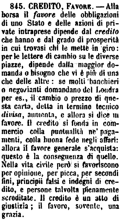 | Credito, Favore - Alla borsa il favore delle obbligazioni di uno Stato e delle azioni di private intraprese dipende dal credito che hanno e dal grado di prosperità in cui trovasi chi le mette in giro: per le lettere di cambio su le diverse piazze, dipende dalla maggior domanda o bisogno che vi è più di una che delle altre: se molti banchieri o negozianti domandano del Londra per es., il cambio o prezzo di questa carta, detta in termine tecnico divisa, aumenta, e allora si dice in favore. Il credito si fonda in commercio colla puntualità ne' pagamenti, colla buona fede negli affari: allora il favore generale s'acquista: questo è la conseguenza di quello. Nella vita civile però si favoriscono per opinione, per picca, per secondi fini, principii falsi e indegni di credito, e persone talvolta pienamente screditate. Il credito è un atto di giustizia; il favore, sovente, una grazia. [immagine] |