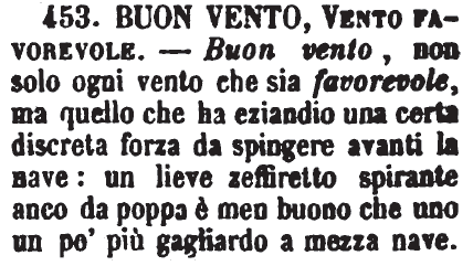 | Buon vento, Vento favorevole - Buon vento, non solo ogni vento che sia favorevole, ma quello che ha eziandio una certa discreta forza da spingere avanti la nave: un lieve zeffiretto spirante anco da poppa è men buono che uno un po' più gagliardo a mezza nave. [immagine] |