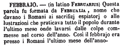 | Febbrajo - (in latino Februarius) Questa parola fu formata da Februalia, nome che davano i Romani ai sacrifizj espiatorj o alle lustrazioni che praticava tutto il popolo durante l'ultimo mese onde lavarsi dalle colpe commesse nel corso dell'anno. Così il febbrajo era presso i Romani l'ultimo mese dell'anno- [immagine] |