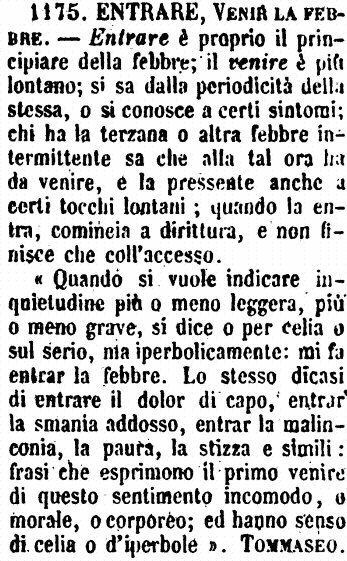 «Quando si vuole indicare inquietudine più o meno leggera, più o meno grave, si dice o per celia o sul serio, ma iperbolicamente: mi fa entrar la febbre. Lo stesso dicasi di entrare il dolor di capo, entrar la smania addosso, entrar la malinconia, la paura, la stizza e simili: frasi che esprimono il primo venire di questo sentimento incomodo, o morale, o corporeo; ed hanno senso di celia o d'iperbole». Tommaseo. [immagine] |