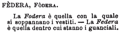 | Federa, Fodera - La Fodera è quella con la quale si soppannano i vestiti. - La Federa è quella dentro cui stanno i guanciali. [immagine] |
