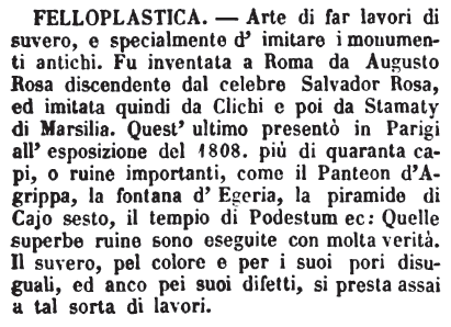 | Felloplastica - Arte di far lavori di suvero, e specialmente d'imitare i monumenti antichi. Fu inventata a Roma da Augusto Rosa discendente dal celebre Salvador Rosa, ed imitata quindi da Clichi e poi da Stamaty di Marsilia. Quest'ultimo presentò in Parigi all'esposizione del 1808. più di quaranta capi, o ruine importanti, come il Panteon d'Agrippa, la fontana d'Egeria, la piramide di Cajo sesto, il tempio di Podestum ec: Quelle superbe ruine sono eseguite con molte verità. Il suvero, pel colore e per i suoi pori disuguali, ed anco pei suoi difetti, si presta assai a tal sorta di lavori. [immagine] |