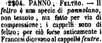 | Panno, Feltro - Il feltro è una specie di pannolano, non tessuto, ma fatto per via di compressione; i cappelli sono di feltro; per ciò forse anticamente i Francesi dicevano al cappello feutre. [immagine] |