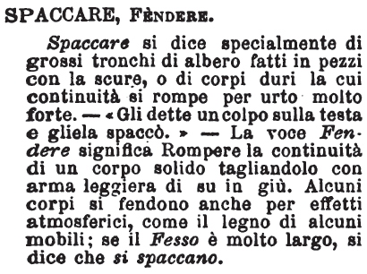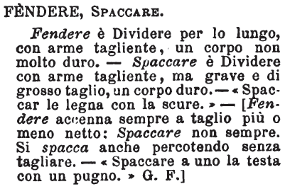| Fendere, Spaccare - Fendere è Dividere per lo lungo, con arme tagliente, un corpo non molto duro. - Spaccare è Dividere con arme tagliente, ma grave e di grosso taglio, un corpo duro. - «Spaccar le legna con la scure.» - [Fendere accenna sempre a taglio più o meno netto: Spaccare non sempre. Si spacca anche percotendo senza tagliare. - «Spaccare a uno la testa con un pugno.» G. F.] [immagine] |