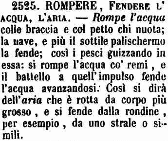 | Rompere, Fendere l’acqua, L’aria - Rompe l'acqua colle braccia e col petto chi nuota; la nave, e più il sottile palischermo la fende; così i pesci guizzando in essa: si rompe l'acqua co' remi, e il battello a quell'impulso fende l'acqua avanzandosi. Così si dirà dell'aria che è rotta da corpo più grosso, e si fende dalla rondine, per esempio, da uno strale o simili. [immagine] |