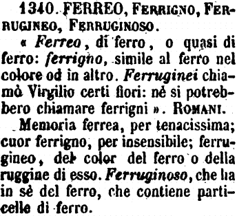 | Ferreo, Ferrigno, Ferrugineo, Ferruginoso - «Ferreo, di ferro, o quasi di ferro: ferrigno, simile al ferro nel colore od in altro. Ferruginei chiamò Virgilio certi fiori: nè si potrebbero chiamare ferrigni». Romani.