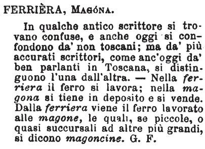 | Ferriera, Magona - In qualche antico scrittore si trovano confuse, e anche oggi si confondono da' non toscani; ma da' più accurati scrittori, come anc'oggi da' ben parlanti in Toscana, si distinguono l'una dall'altra. - Nella ferriera il ferro si lavora; nella magona si tiene in deposito e si vende. Dalla ferriera viene il ferro lavorato alle magone, le quali, se piccole, o quasi succursali ad altre più grandi, si dicono magoncine. G. F. [immagine] |