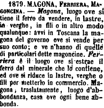 | Magona, Ferriera, Magoncina - Magona, luogo ove si tiene il ferro da vendere, in lastre, in verghe, in fili o in altro modo qualunque: avvi in Toscana la magona del governo ove si vende per suo conto; e ve n'hanno di quelle di particolari dette magoncine. Ferriera è il luogo ove si estrae il ferro dal minerale che lo contiene, ed ove si riduce in lastre, verghe o fili per metterlo in commercio. Magona, traslatamente, luogo d'abbondanza, casa ove ogni bene abbonda. [immagine] |