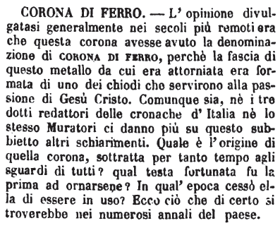 | Corona di ferro - L'opinione divulgatasi generalmente nei secoli più remoti era che questa corona avesse avuto la denominazione di corona di ferro, perchè la fascia di questo metallo da cui era attorniata era formata di uno dei chiodi che servirono alla passione di Gesù Cristo. Comunque sia, nè i tre dotti redattori delle cronache d'Italia nè lo stesso Muratori ci danno più su questo subbietto altri schiarimenti. Quale è l'origine di quella corona, sottratta per tanto tempo agli sguardi di tutti? qual testa fortunata fu la prima ad ornarsene? In qual'epoca cessò ella di essere in uso? Ecco ciò che di certo si troverebbe nei numerosi annali del paese. [immagine] |
