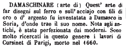 | Damaschinare (arte di) - Quest'arte di far disegni sul ferro e sull'acciajo con fili di oro o d'argento fu inventata a Damasco in Soria, d'onde trae il suo nome. Nota agli antichi, è stata perfezionata dai moderni. Sono molto ricercati in questo genere i lavori di Cursinet di Parigi, morto nel 1660. [immagine] |