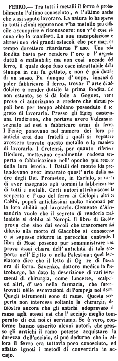 | Ferro - Tra tutti i metalli il ferro è probabilmente l'ultimo conosciuto, e l'ultimo anche che siasi saputo lavorare. La natura lo ha sparso in tutti i climi; eppure non v'ha metallo più difficile a scuoprire e riconoscere: non v'è cosa alcuna che lo manifesti. La sua manipolazione è altresì uno dei grandi ostacoli che per maggior tempo dovettero ritardarne l'uso. Una sola fondita basta per rendere l'oro e l'argento duttili e malleabili; ma non così accade del ferro, il quale dopo fuso esce intrattabile dalla stampa in cui fu gettato, e non è più duttile di un sasso. Fu dunque d'uopo, innanzi di poter fabbricare il ferro, trovar l'arte di addolcire e render duttile la prima fondita. Ciò non ostante, se si dà fede a Goguet, varie prove ci autorizzano a credere che alcuni popoli ben per tempo abbiano posseduto il segreto di lavorarlo. Presso gli Egizj esisteva una tradizione, che portava avere Vulcano insegnato ad essi a fabbricare armi di ferro. I Fenicj ponevano nel numero dei loro più antichi eroi due fratelli i quali si reputava avessero trovato questo metallo e la maniera di lavorarlo. I Cretensi, per quanto riferisce Diodoro, mettevano egualmente codesta scoperta e fabbricazione nell'epoche più remote della loro istoria. I Dattili del monte Ida pretendevano aver imparato quest'arte dalla madre degli Dei. Prometeo, in Eschilo, si vanta di aver insegnato agli uomini la fabbricazione di tutti i metalli. Certi autori attribuiscono la scoperta e l'uso del ferro ai Ciclopi; altri ai Calibi, popoli antichissimi molto rinomati per la loro abilità nel lavorarlo. Clemente d'Alessandria vuole che il segreto di renderlo malleabile si debba ai Noropi. Il libro di Giobbe prova che sino dai secoli che trascorsero dal diluvio alla morte di Giacobbe si conoscesse e si sapesse ridurre in parecchie contrade. I libri di Mosè possono pur somministrare una prova assai chiara dell'antichità di tale scoperta nell'Egitto e nella Palestina; quel legislatore dice che il letto di Og re di Basan era di ferro. Savenko, dottore medico in Pietroburgo, ha dato la descrizione di vari istrumenti di chirurgia, come lancette, scalpelli ed altri, d'uso nella farmacia, che furono trovati nelle escavazioni di Pompeja nel 1819. Quegli istrumenti sono di rame. Questa scoperta non interessa soltanto la chirurgia, dimostra ancora che gli antichi adopravano il rame agli stessi usi che l'acciajo meglio temperato di cui noi ci serviamo. Se è vero, conforme hanno asserito alcuni autori, che presso gli antichi il rame potesse acquistare la durezza dell'acciajo, si può dedurne che in allora il ferro era tuttavia poco conosciuto, ed affatto ignoti i metodi di convertirlo in acciajo. [immagine] |