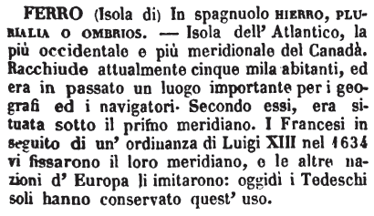 | Ferro (isola di) - In spagnuolo hierro, plurialia o ombrios. - Isola dell'Atlantico, la più occidentale e più meridionale del Canadà. Racchiude attualmente cinque mila abitanti, ed era in passato un luogo importante per i geografi ed i navigatori. Secondo essi, era situata sotto il primo meridiano. I Francesi in seguito di un'ordinanza di Luigi XIII nel 1634 vi fissarono il loro meridiano, e le altre nazioni d'Europa li imitarono: oggidì i Tedeschi soli hanno conservato quest'uso. [immagine] |