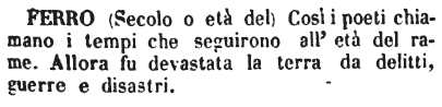 | Ferro (secolo o età del) - Così i poeti chiamano i tempi che seguirono all'età del rame. Allora fu devastata la terra da delitti, guerre e disastri. [immagine] |
