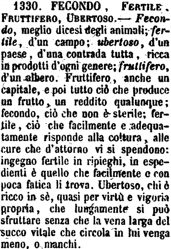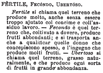 | Fecondo, Fertile, Fruttifero, Ubertoso - Fecondo, meglio dicesi degli animali; fertile, d'un campo; ubertoso, d'un paese, d'una contrada tutta, ricca in prodotti d'ogni genere; fruttifero, d'un albero. Fruttifero, anche un capitale, e poi tutto ciò che produce un frutto, un reddito qualunque; fecondo, ciò che non è sterile; fertile, ciò che facilmente e adeguatamente risponde alla coltura, alle cure che d'attorno vi si spendono: ingegno fertile in ripieghi, in espedienti è quello che facilmente e con poca fatica li trova. Ubertoso, chi è ricco in sè, quasi per virtù e vigoria propria, che lungamente si può sfruttare senza che la vena larga del succo vitale che circola in lui venga meno, o manchi. [immagine] |